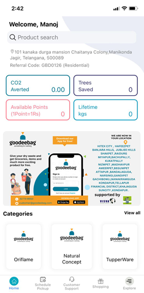 Goodeebag is a unique concept in India that aims to promote sustainability and responsibility among the citizens. It is an end-to-end application that connects users, drivers, investors, and dry-weight officers in a seamless and efficient way. Users can collect dry waste from their homes and schedule a pickup by the drivers. Based on the weight of the waste, users get points on the mobile application that they can use to purchase products made from the waste by Goodeebag. Users can also get corporate logins and access various benefits and offers. The application has different dashboards for different users, such as driver dashboards, user dashboards, investor dashboards, dry weight officer dashboards, etc.